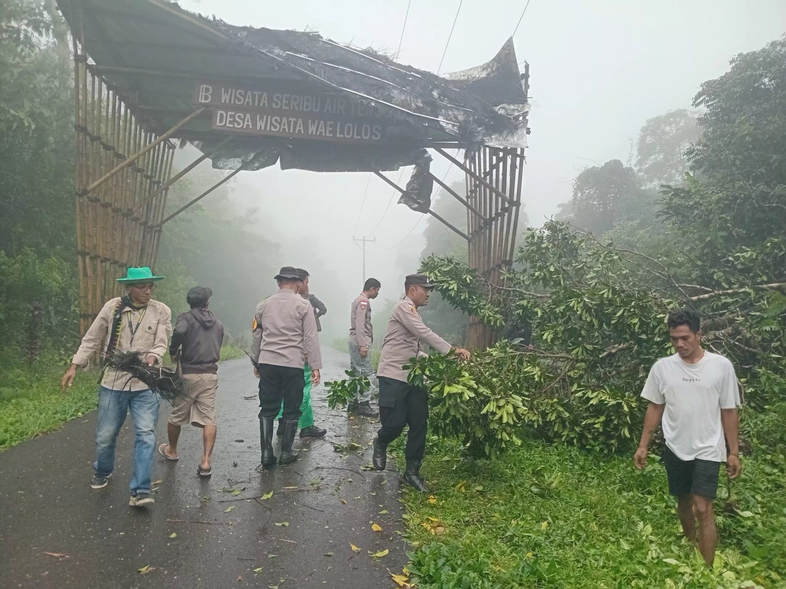 MANGGARAI BARAT – Akses menuju Desa Wisata Wae Lolos, Kecamatan Sano Nggoang, Kabupaten Manggarai Barat, Nusa Tenggara Timur, kembali normal setelah sempat terhambat akibat pohon tumbang yang merobohkan gapura ikonik desa. Penanganan cepat dilakukan melalui aksi tanggap darurat yang dipimpin langsung Kapolsek Sano Nggoang, Risbel Pandiangan, Selasa pagi.