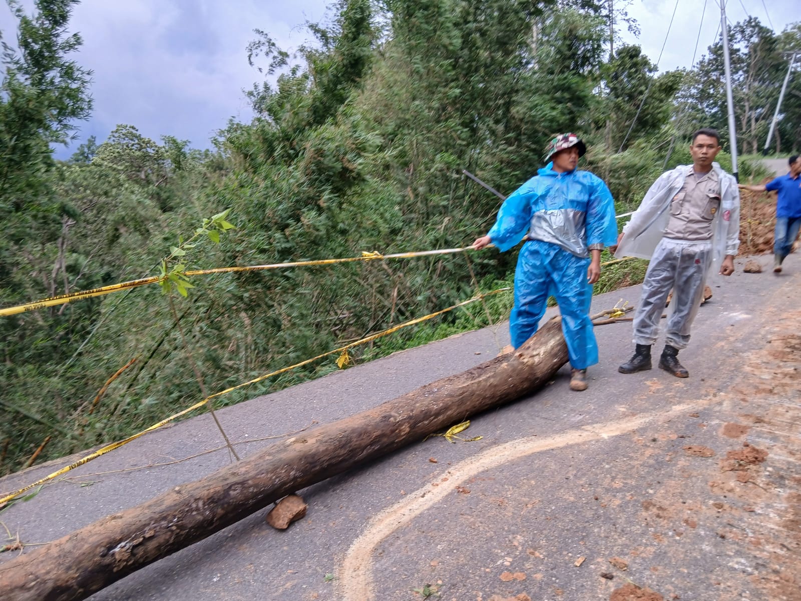Pemerintah mengimbau warga yang melintas menggunakan kendaraan roda dua untuk tetap waspada terhadap pohon tumbang dan material kerikil yang licin.