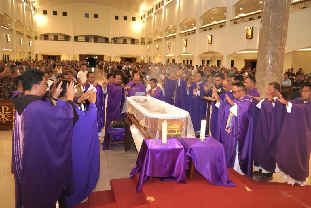 Kesakralan Misa Pemakaman ini semakin terasa dengan kehadiran puluhan Imam konselebran yang berdiri melingkari altar sebagai bentuk persaudaraan imamat.