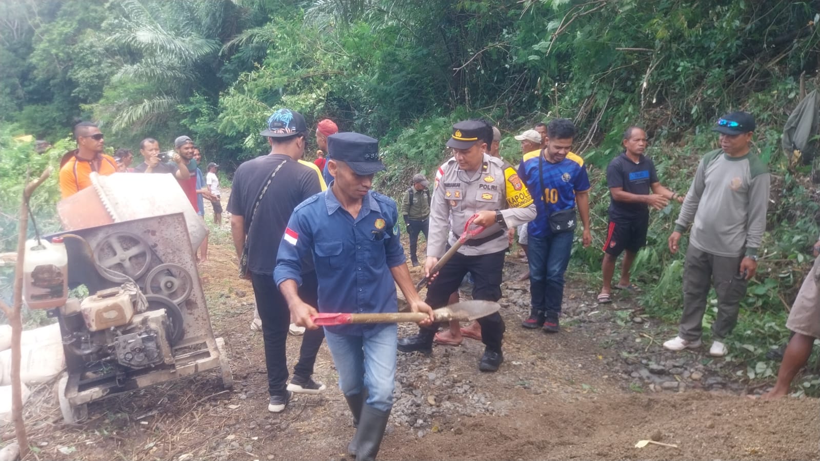 Di lokasi kegiatan, personel kepolisian, aparat pemerintah, dan warga terlihat bekerja secara bergantian. Sebagian warga mengangkut material berupa batu dan pasir, sementara lainnya mencampur semen dan meratakan permukaan jalan yang berlubang.