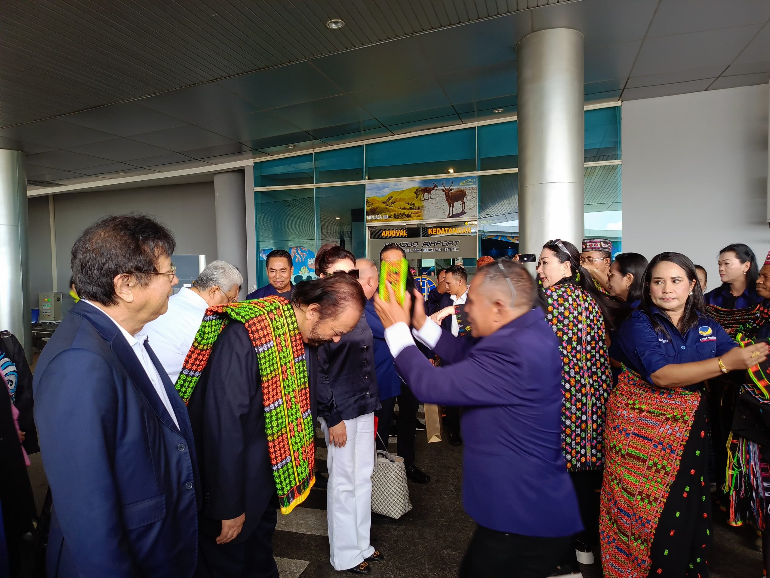 Di Bandara Internasional Komodo, Labuan Bajo Surya Paloh bersama rombongan DPP Partai NasDem disambut dengan acara adat serta iringan tarian Sanda oleh komunitas adat Manggarai.